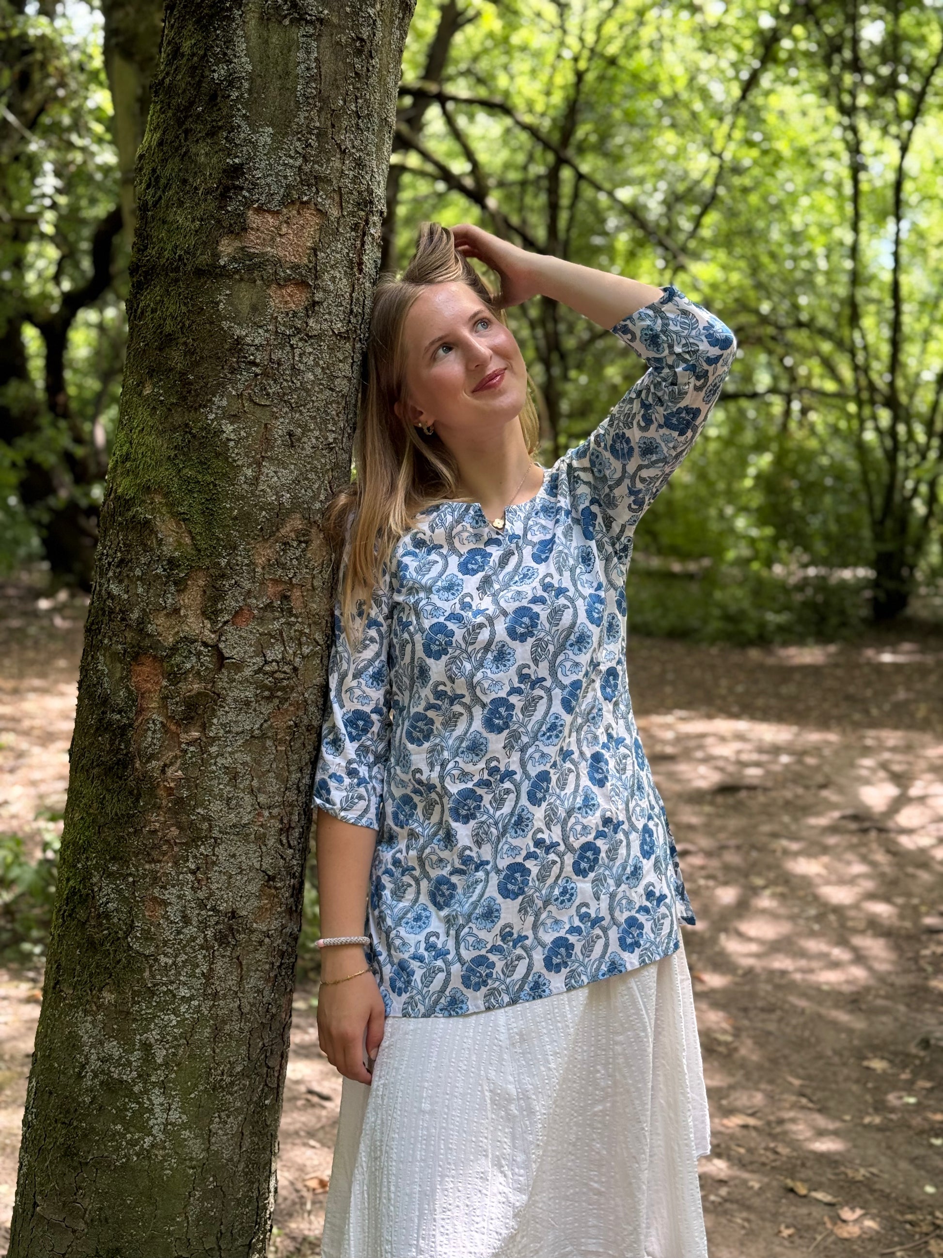 Dieses Oberteil ist von einer Kurta inspiriert, dem Oberteil eines traditionellen indischen Kleidungsstücks, das sowohl von Männern als auch von Frauen getragen wird. Die drei Viertelärmel verleihen ihm einen eleganten, lässigen Look, der auch im Büro mit Hosen, Caprihosen oder Jeans getragen werden kann.