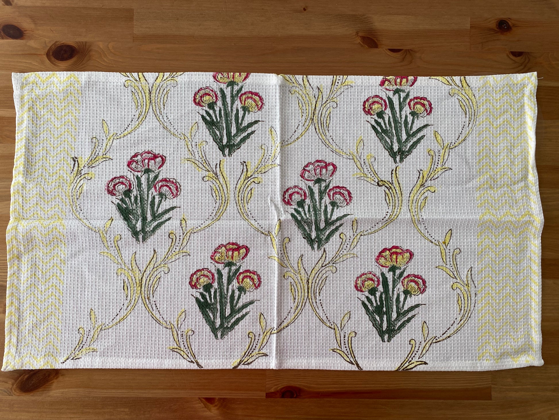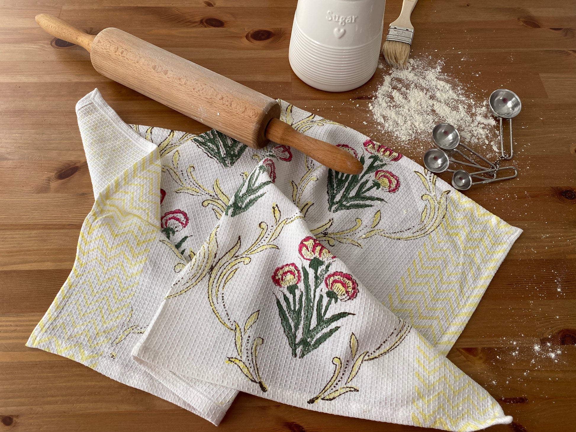 Unsere wunderschönen Geschirrtücher mit Blumenmuster verleihen Ihrer Küche genau die richtige Farbe oder Picknicktisch. Sie sind handblockbedruckt und haben eine schöne Waffelstruktur, die Feuchtigkeit gut aufnimmt.