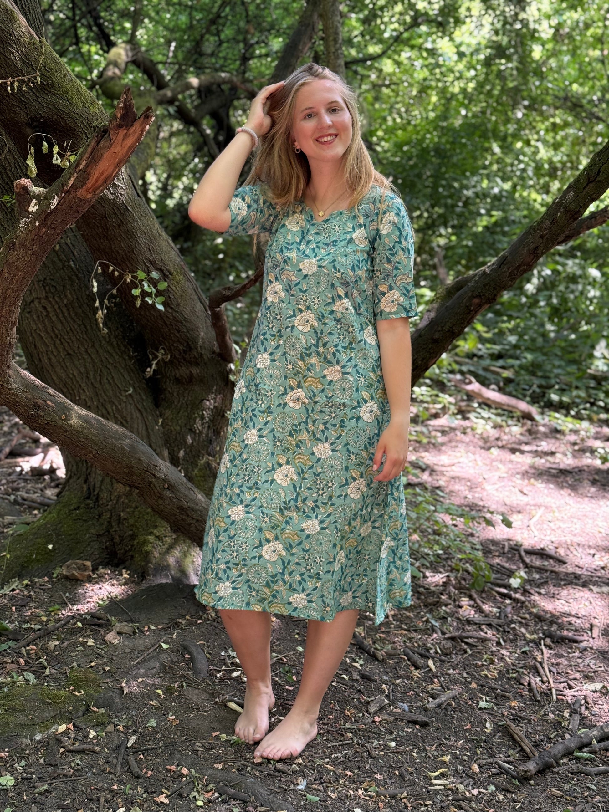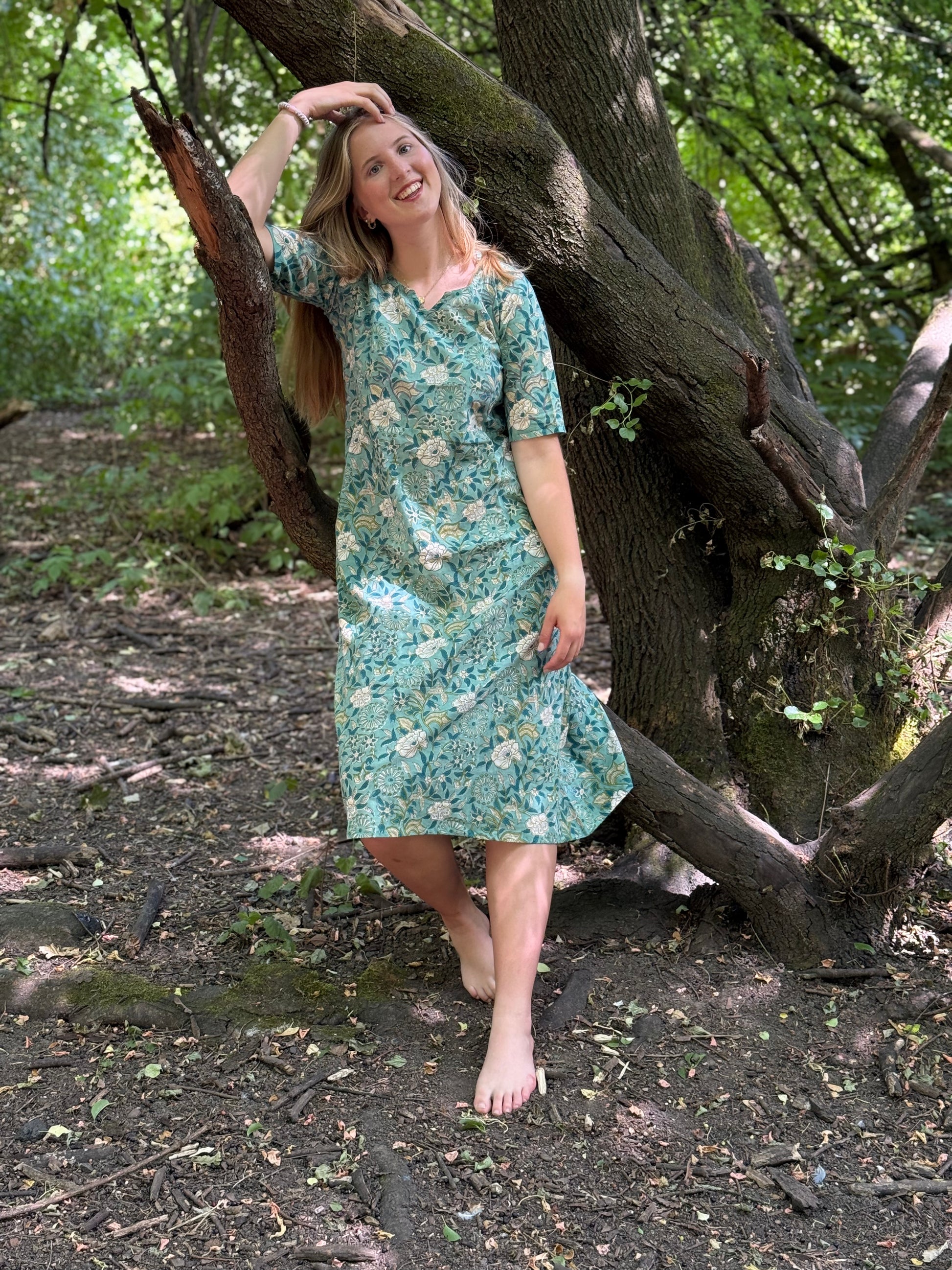 This soft green dress dotted with white peonies has a simple and clean silhouette with an A-line flair from the waist down. This dress was inspired from the dash of positivity we often need among our busy lives. Wear this dress on the days that you want to feel nothing but joy. Its professional looking cut also adds confidence to your look for the day.